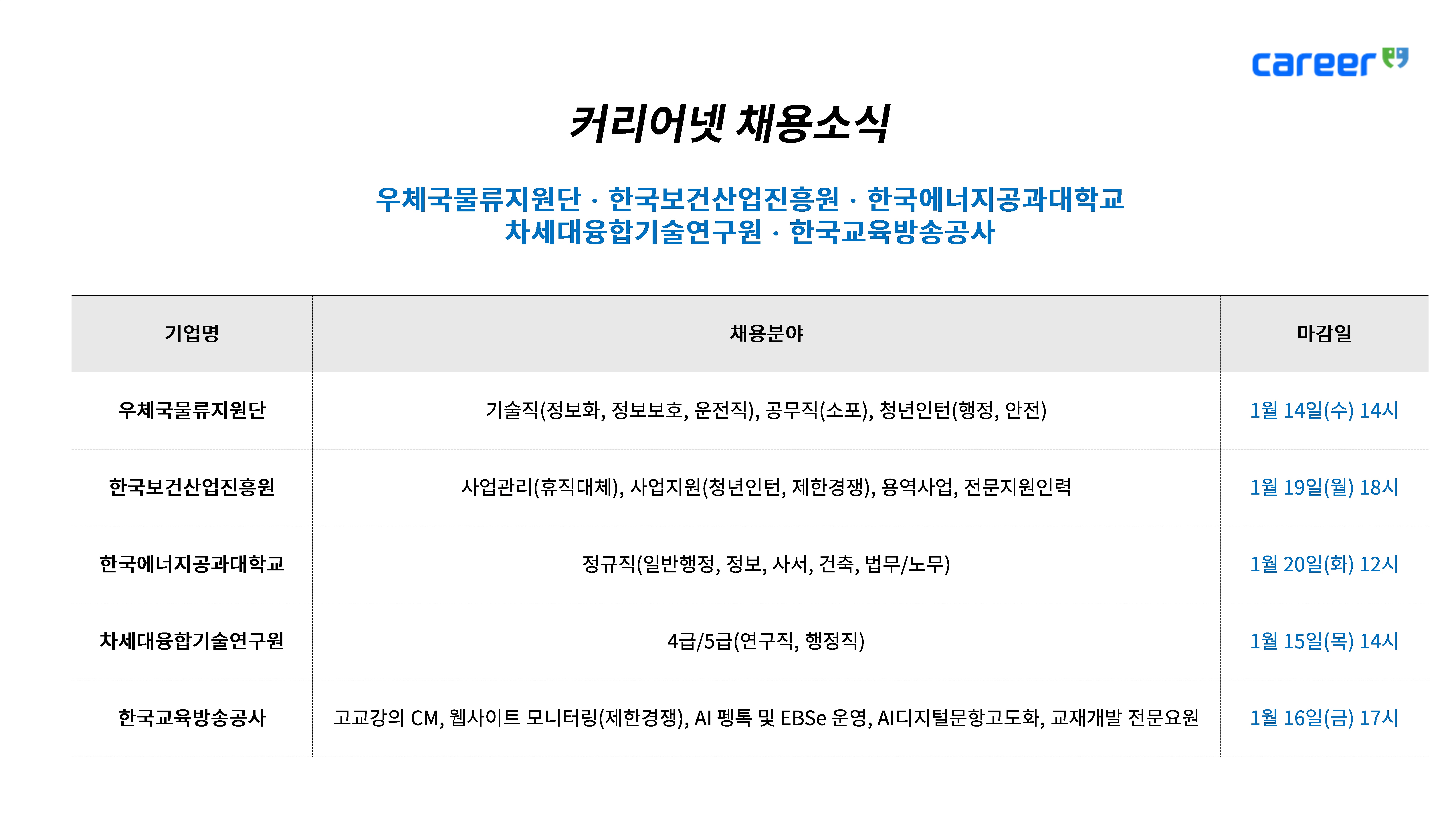 확인할 수 있다. 전형 절차는 서류전형, 인성검사, 면접전형, 임용면담을 거쳐 최종 합격자를 발표할 예정이다. 지원서는 1월 19일(월) 18시까지 채용 홈페이지를 통해 온라인 접수하면 된다.